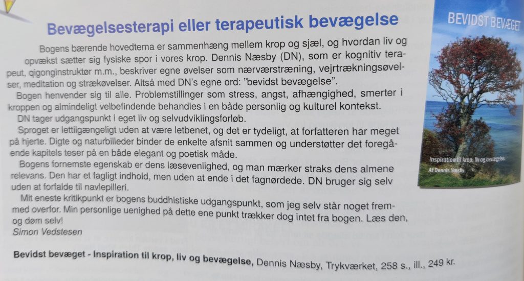 “Bogen “Bevidst bevæget” giver læseren en tydelig fornemmelse af sammenhængen mellem det kropslige og det mentale formidlet via teori og forfatterens personlige erfaringer. Alt sammen krydret med flotte fotos og fine digte, der fastholder læseren, giver plads til refleksion og tid til en dyb indånding.